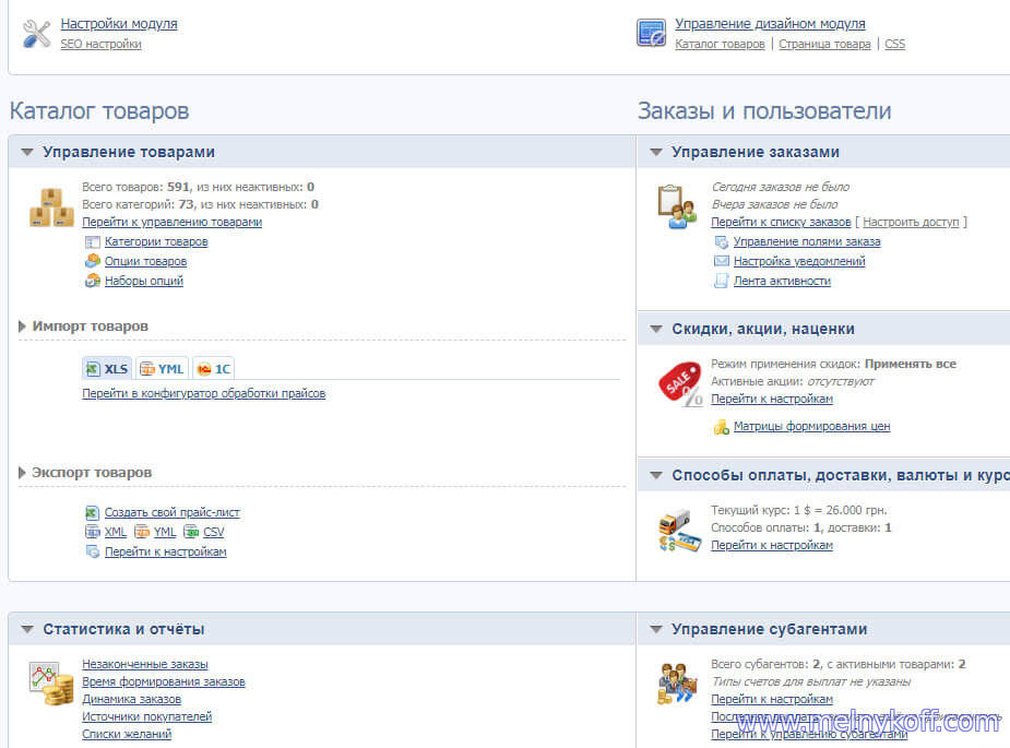 Функция перезвоните мне или вопрос по товару без проблем организовывается. Замена цен на определенные группы товаров, быстрое изменение курсов валют. Весь учет по товарам и остаткам из склада ведется онлайн. Различные способы оплаты и доставки. Управления полями заказа. Работа с агентами и скидками. Выдача промо-кодов одноразовых и многоразовых, акции в определенные дни и другие полезные фишки. Все уведомления вам и покупателю приходят на почту, сделать можно и на телефон. Полная статистика по движению товара. Возможность создавать матрицы формирования цен. Импорт и экспорт товаров из подготовленного прайса. Подключение к программе 1С, экспорт выполненных заказов в магазине. Автоматическое создание полного своего прайса в формате Exel.
