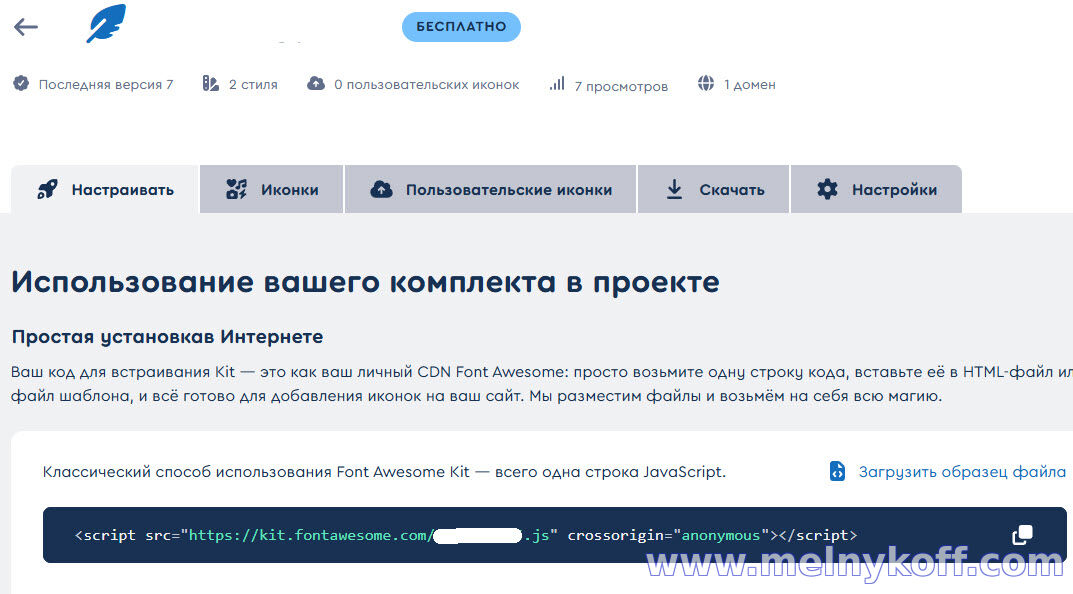 Сайт fontawesome на английском, при желании правой кнопкой в хроме все переводиться легко на ваш язык. Из тонкостей настроек, примерная ссылка fontawesome.com/kits/ваш_идентификатор/settings. Кроме домена если нужно изменить, другое лучше ничего не трогайте.