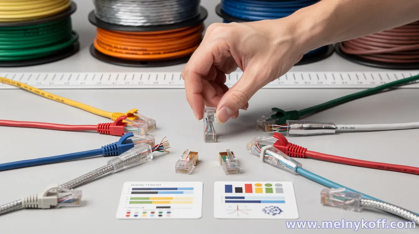 Выбор кабеля витой пары начинается с определения требований к сети: необходимая скорость передачи данных, длина участка и условия эксплуатации. Ключевые параметры — это категория кабеля (Cat5e, Cat6, Cat6a и выше), тип проводников (solid или stranded), экранирование (UTP, F/UTP, S/FTP и т. д.) и характер использования (домашняя, офисная, промышленная).